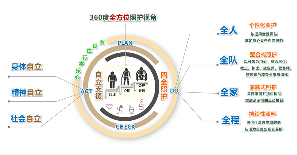 以人为本的个性化照护+以团队专业性为首的整合式服务+以关怀协助为目标的家庭式照护+以生命周期服务为过程的持续性照料,实现长者们身体、精神和社会的自立
